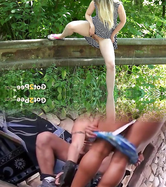klobige hellhaarige dame legt ihre beine auf den zaun und pinkelt